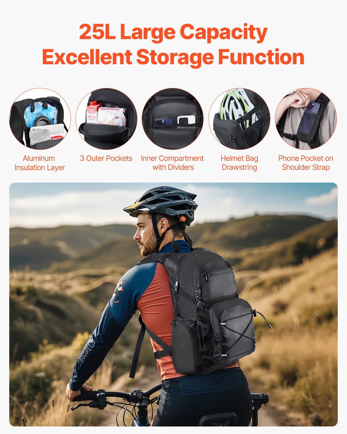 Features & Details Practical & Innovative Water Bladder: This hydration backpack has a large opening for effortless filling and cleaning. It features an automatic shut-on/off valve to avoid leakage, a 360° mouthpiece with a dust-proof cap to maintain hygiene, an ergonomic handle design for convenience and functionality. Experience a seamless and convenient drinking experience. 2L Practical Water Bladder: The hiking backpack with water bladder includes a food-grade TPU water bladder, ensuring a pleasant drinking experience. Its leak-proof automatic shut-on/off valve and sealed detection technology avoid leak risks, providing you with peace of mind. Durable & Waterproof Polyester: The running backpack is made from waterproof polyester material. It is tear-resistant and abrasion-resistant for various outdoor conditions. The brand zippers are tested 3000 times for long-lasting durability. Experience smooth and effortless use on adventures and long trips. Your Ideal Storage Companion: The hydration pack backpack boasts a 25L large-capacity design. In addition to the main pocket for a 2L water bag, the large-capacity main pocket can also store clothes and tablets, multiple inner pockets hold wallets, phones, food and other items, while the outer layer features elastic storage cord for attaching hiking poles, shoes, clothes, towels and other gear. Flexible and customizable storage keeps every item within reach. Security and Functionality Outdoors: This hiking hydro backpack offers breathable mesh back padding to reduce stuffiness, and shoulder and waist straps with foam padding fit securely, providing a comfortable all-day carrying experience. Water tube clips and an emergency whistle enhance security performance, making it suitable for cycling, long-distance hiking, outdoor traveling, mountaineering and other multi-scenario needs.